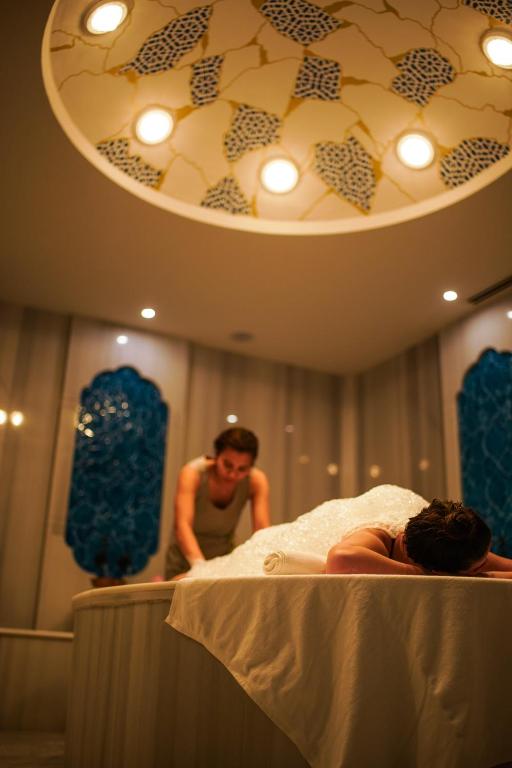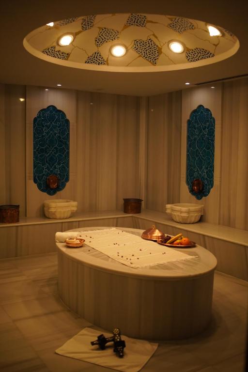 Renovated in 2019, this 5-star hotel offers luxurious rooms with a flat-screen TV in Bursa city center. Facilities include 4 restaurants, a spa and an outdoor pool with a terrace overlooking the city. The air-conditioned rooms at the Almira Thermal & Convention Center are decorated with warm colors and elegant wooden furniture. All rooms have cable TV, a mini-bar and coffee and tea making facilities. Guests can relax by the swimming pool at the Havuz Restaurant, which offers an à la carte menu. After a delicious meal, cocktails can be enjoyed at one of the 3 bars. Almira Thermal & Convention Center offers many health and leisure facilities, including an indoor thermal pool with an artificial waterfall, an authentically styled hammam, and a vitamin bar. The Bursa Grand Mosque is 1.6 mi from Almira Thermal & Convention Center while Kent Meydanı Shopping Center is 656 feet away. Nilufer Organized Industrial Zone is 8.1 mi and TUYAP Fair Center is 3.7 mi away. Yenisehir Airport is 28 mi and the peak of Uludag is about 25 mi away.Sabiha Gokcen Airport is 73 mi from the property.